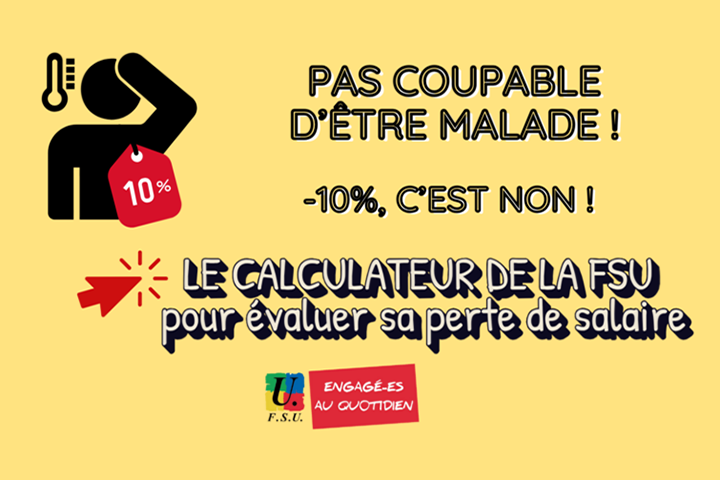 La FSU met à disposition un simulateur. Il permet de calculer la rémunération que vous pourriez perdre pour une grippe, une blessure vous empêchant de travailler ou plus simplement pour de l’épuisement professionnel. Il suffit de renseigner le montant du traitement brut et le montant de vos indemnités et primes que vous pouvez retrouver sur votre bulletin de paie.