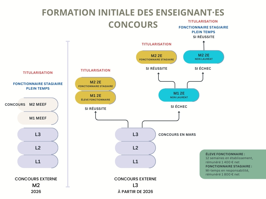 Après ce premier échec, les gouvernements successifs choisissent de repositionner les concours à Bac+3 et la rémunération des lauréat·es en M1 (avec un tiers-temps de stage) et en M2 (contre un mi-temps de responsabilité de classe), comme levier d’attractivité. Ils auraient pu choisir l’amélioration des conditions de travail et de formation, l’allègement des effectifs de classes, la revalorisation salariale… Mais non. Les ministères de l’Éducation Nationale et de l’Enseignement Supérieur et de la recherche restent sourds aux propositions et aux analyses que nous portons au sein des groupes de travail.