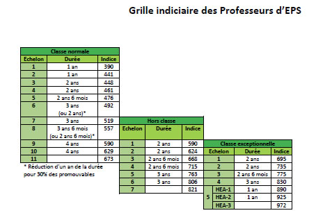 Nous avons également obtenu l’intégration de la hors échelle lettre A, précédemment appelé échelon spécial, dans le déroulement classique de la grille indiciaire. Cela représente une avancée majeure pour tous les professeurs d’EPS promu.es à la classe exceptionnelle.