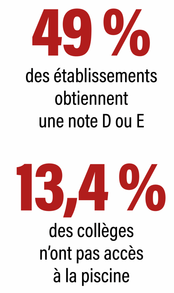 Côté état des équipements sportifs, les résultats sont tout aussi préoccupants : 81 % des gymnases obtiennent une note moyenne ou faible (C, D ou E) en termes de fonctionnalité, et 71 % en matière d’écoresponsabilité, santé et sécurité. Le SNEP-FSU a toujours alerté sur la nécessité de rénovation des équipements sportifs. Particulièrement ceux construits avant 2005, soit 85 % d’entre eux, car leurs normes de construction ne répondent pas aux obligations de réduction de 40 % des émissions de CO2 à l’horizon 2030 (décret tertiaire).
