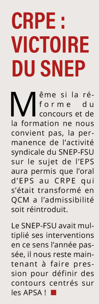 Le SNEP-FSU était pour rediscuter de la formation mais pas dans ce format, et surtout continuera de revendiquer que les stagiaires ne soient pas moyens d’enseignement, et aussi que les enseignant·es bénéficient de meilleurs salaires et conditions de travail, condition sine qua non pour lutter contre la crise d’attractivité des différents concours de la Fonction publique même si l’EPS y est confrontée dans une moindre mesure.