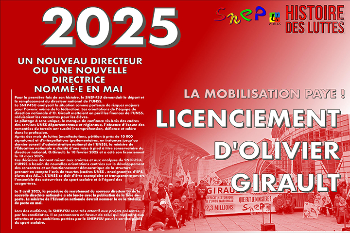 Après des mois de luttes (manifestations, pétition à près de 10 000 signatures) et d’interpellations (parlementaires, en instances jusqu’au dernier conseil d’administration national de l’UNSS), la ministre de l’Éducation nationale a décidé d’une mise à pied à titre conservatoire du directeur national, O.Girault, le 10 février 2025 et a acté son licenciement le 13 mars 2025.